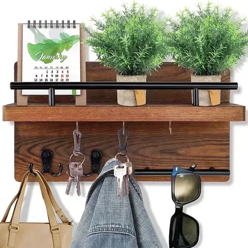 Wooden Keychain Storage Rustic Farmhouse Entryway Shelf with 4 Double Hooks Decorative Rack Home Decoration Shelves